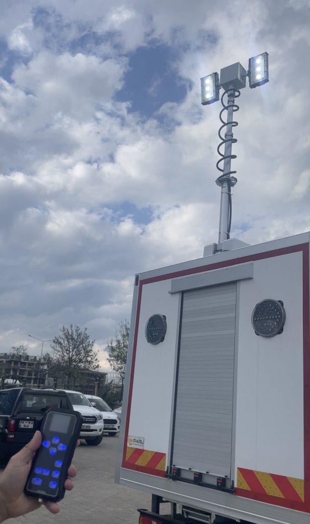 Uzaktan kumandalı istenilen özelliklere göre sağ-sol ve yukarı-aşağı yönlü hareket kabiliyetine sahiptir. İstenilen güç kaynağına uygun 12/24 Volt veya 220 Volt ile çalışma imkanı mevcuttur. Mast yüksekliği, 1 metreden, 5 metreye kadar ayarlanabilmektedir. Mast elektropnömatik veya elektrohidrolik olarak ayarlanabilinmektedir. Üzerinde isteğe bağlı adetlerde LED ya da Metal Halojen lambalar kullanılabilinmektedir.