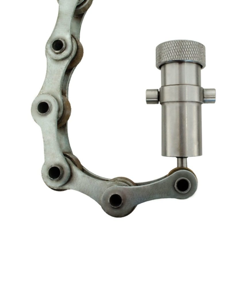 - Farklı boru çaplarını kesmek için kılavuz zincir, zincir baklaları ile azaltılır, gerdirme zinciri farklı bir konuma sabitlenir ve daha sonra sadece zincir gerdirici ile gerdirilir.
